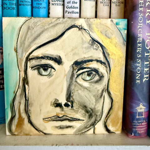 Original painting on cradled wood panel, approximately 6x6 inches (3/4 in deep). Finished with a wax luster glaze.
