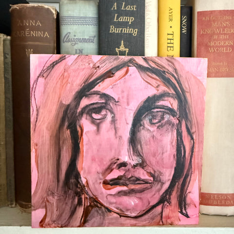 Original painting on cradled wood panel, approximately 6x6 inches (3/4 in deep). Finished with a wax luster glaze.
